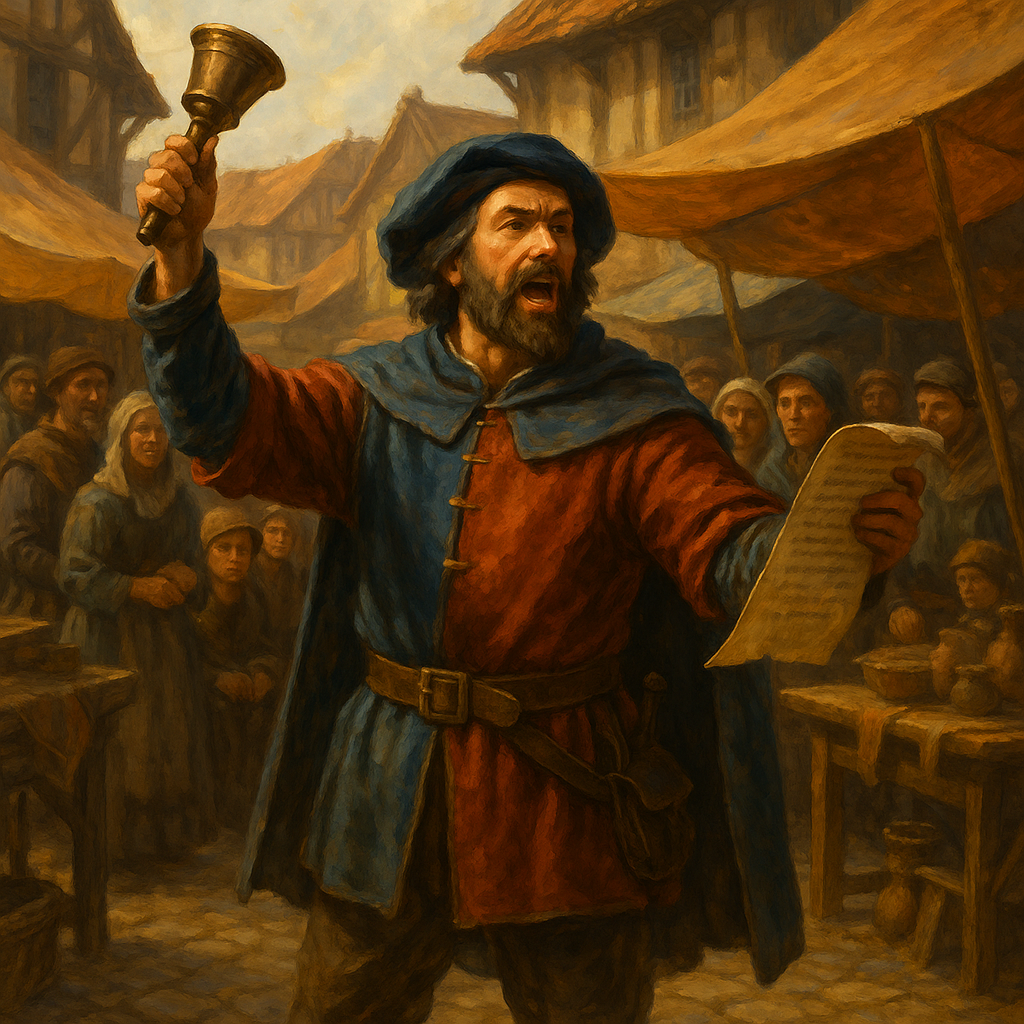 Bayangkan kamu hidup di abad pertengahan. Enggak ada koran, radio, apalagi media sosial. Lalu suatu hari, seorang pria bersuara lantang berdiri di tengah pasar, mengetuk lonceng, dan berteriak, “Dengarkan! Dengarkan!”
