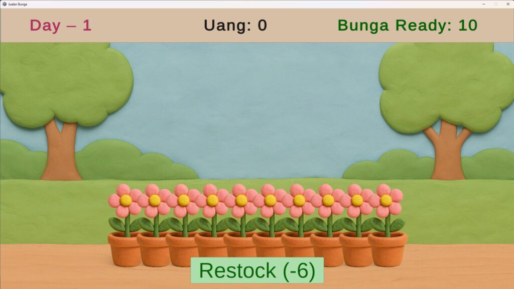 Saya pun kemaren berhasil bikin game sederhana ini setelah dua hari belajar. Kalo mau donlot silahkan, itu .exe, ya: Jualan Bunga Games