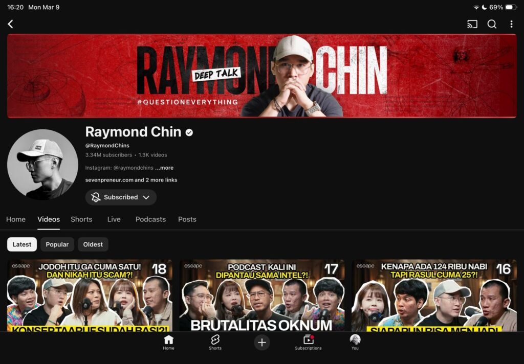 Sepanjang Ramadan tahun lalu, saya rutin nonton Escape di kanal Youtube-nya Raymond Chin. Di tahun lalu, di episod-episod awal, belum ada Verren Ornela. Masih Raymond dan Ust. Felix Siaw aja. Menjelang pertengahan, mulai masuk Verren karena dia banyak nanya.